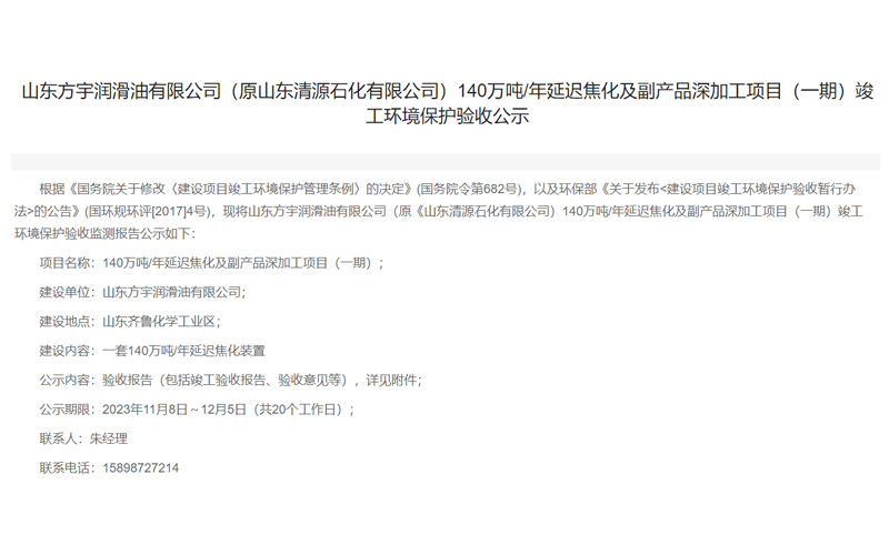 根據《國務院關于修改〈建設項目竣工環境保護管理條例〉的決定》(國務院令第682號),以及環保部《關于發布<建設項目竣工環境保護驗收暫行辦法>的公告》(國環規環評[2017]4號),現將山東方宇潤滑油