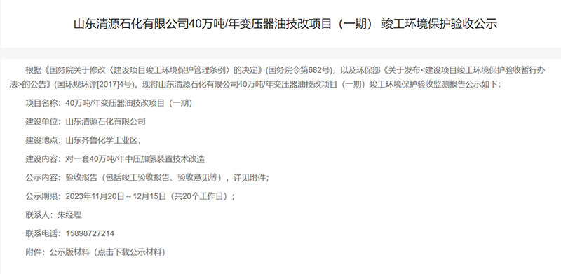 山東清源石化有限公司40萬噸/年變壓器油技改項目(一期)竣工環境保護驗收公示